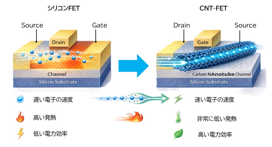 CNTは電子の散乱が少ないため、同じ性能を出すために必要な電力がシリコンより大幅に少なくて済みます。