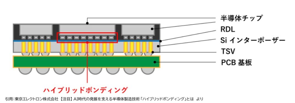 ハイブリッド接合により、プロセッサとメモリ(HBM)が隙間なく直結され、データの往復時間が大幅に短縮されます。