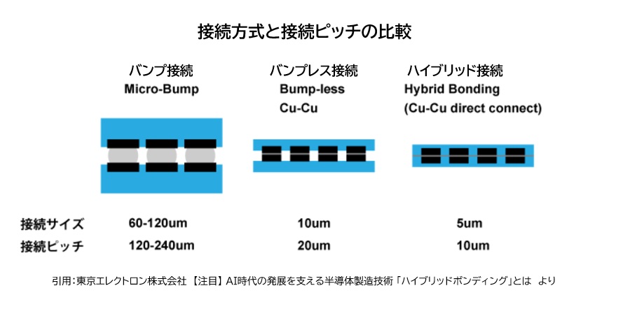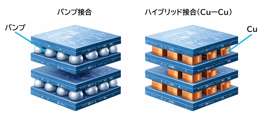 - ハイブリッド接合:ハンダを使わず、銅電極を絶縁層に埋め込む構造のため、10μm以下まで微細化可能。